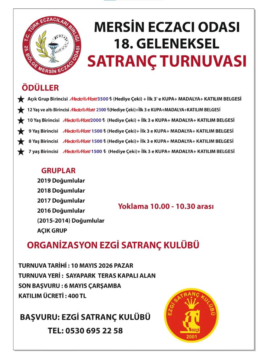 Ezgi Satranç Kulübü’nün organizasyonu ile düzenlemiş olduğumuz, bu yılda 18. si gerçekleşecek olan Mersin Eczacı Odası Geleneksel Satranç Turnuvası 10 Mayıs 2026 tarihinde Sayapark Teras'ta (Kapalı Alan) yapılacaktır.