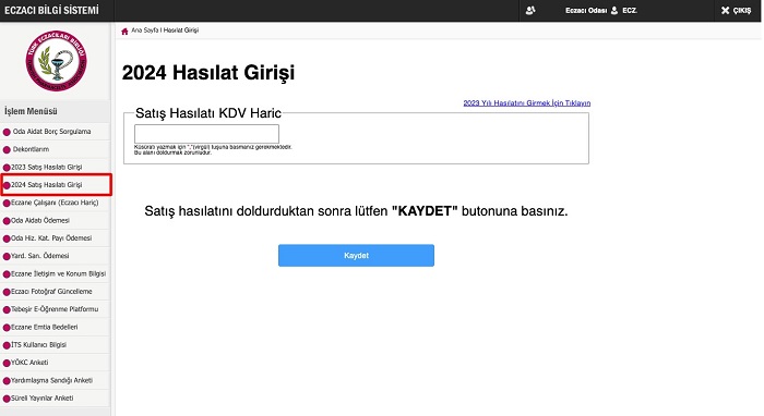 2024 YILI HASILAT BİLGİSİNİN ECZACI BİLGİ SİSTEMİNE KAYIT EDİLMESİ HAKKINDA