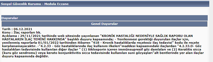 Konu hakkında bu kez Medula Eczane Provizyon Sistemi’nde 06.12.2021 tarihinde yayımlanan “İlaç Raporları Hk.” konulu duyuru ile,