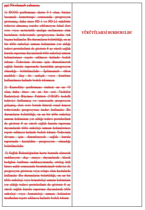 "Danıştay Onuncu Dairesinin 30.09.2024 tarihli ve 2020/5431 Esas numaralı ve 2024/3496 sayılı kararı ile; 21/03/2018 tarih ve 30367 sayılı Resmî Gazete'de yayımlanan Sosyal Güvenlik Kurumu Sağlık Uygulama Tebliğinde Değişiklik Yapılmasına Dair Tebliğ ile değişiklik yapılan Sosyal Güvenlik Kurumu Sağlık Uygulama Tebliğinin 4.2.14.C maddesinin üçüncü fıkrasının "Nivolumab yalnızca" başlıklı (pp) alt bendi maddesinin yürütülmesi durdurulmuştur.