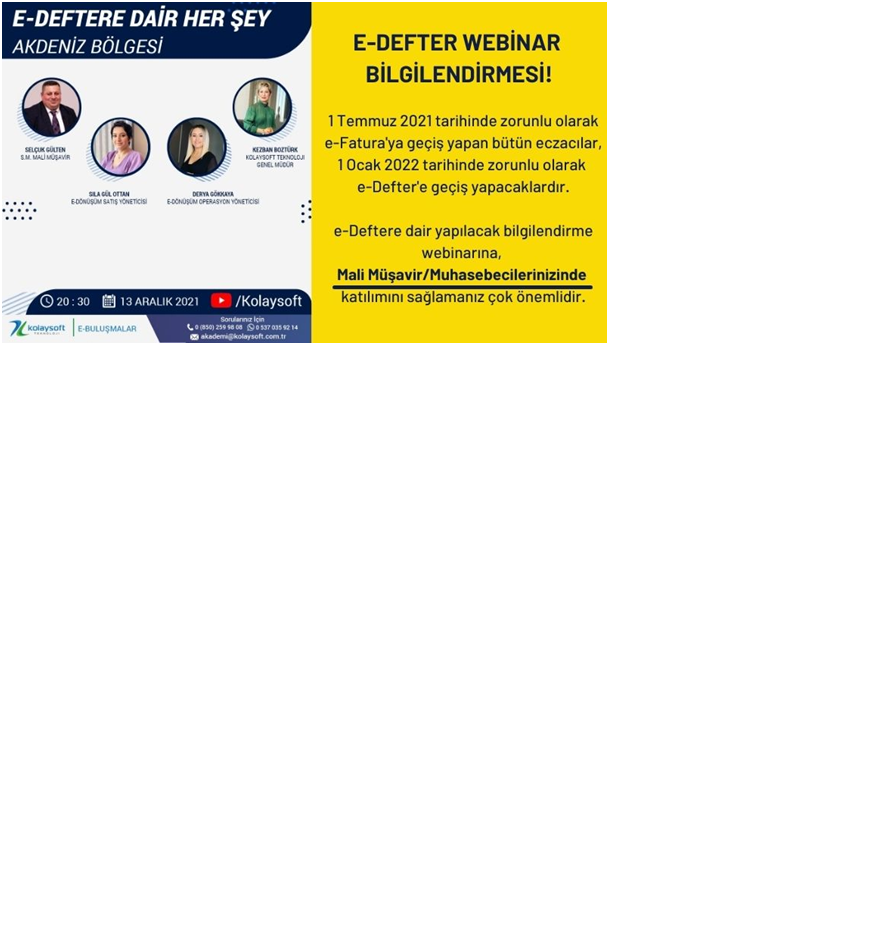 Kolaysoft işbirliğiyle düzenlenecek olan e-defter bilgilendirme webinarı 13 Aralık Pazartesi günü Saat 20:30 da online olarak gerçekleşecektir.