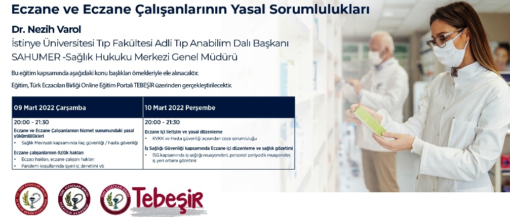 9 - 10 Mart 2022 tarihlerinde 20.00 - 21.30 saatleri arasında Dr. Nezih VAROL tarafından Tebeşir Online Eğitim Platformu üzerinden üyelerimiz için "Eczane ve Eczane Çalışanlarının Yasal Sorumlulukları" konulu eğitim gerçekleştirilecektir. Eğitim konuları, eğitim linki ve TEBEŞİR Türk Eczacıları Birliği Online Eğitim Platformu Giriş Yönergesi aşağıda yer almakta olup,